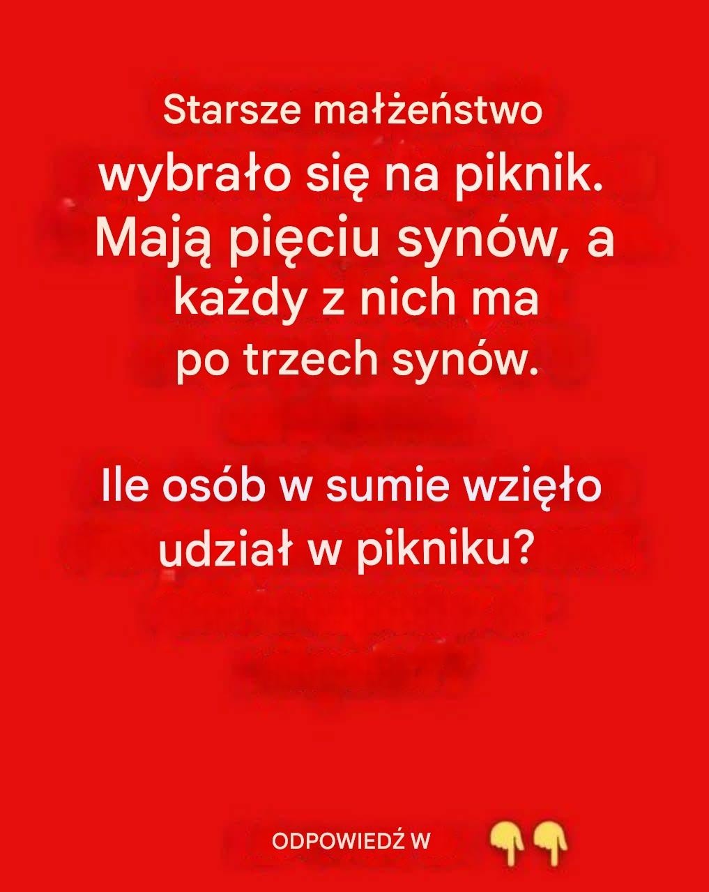 „Pewna starsza para wybrała się na piknik. Mają 5 synów, a każdy syn ma 3 dzieci. Ile osób wzięło udział w pikniku?”.